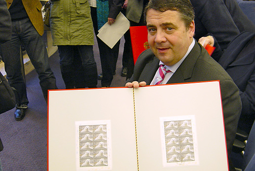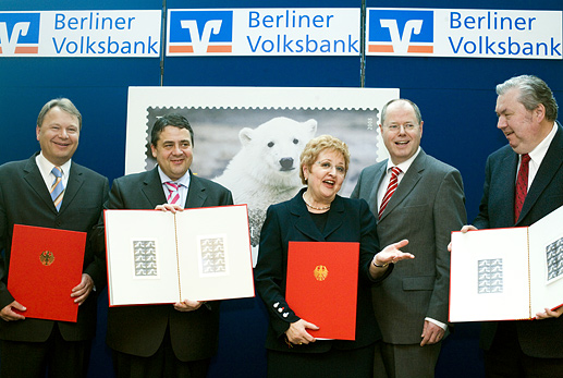 Am 10. April 2008 wird die von Erdmann Design gestaltete Briefmarke »Für den Umweltschutz, Natur weltweit bewahren« offiziell von der deutschen Post ausgegeben. Die Knut-Briefmarke hat einfach noch gefehlt und fügt sich gut in die wiederkehrende Eisbären-Begeisterung ein. Konzeptionell bestimmt die klare und deutliche Abbildung des Eisbären die Gestaltung. Die insgesamt sehr positive Ausstrahlung der Marke spricht breite Bevölkerungskreise an und trägt damit der Verwendung als Zuschlagmarke Rechnung. Das Motiv »Knut« wird dabei als Symbol für die Thematisierung der Bedrohung der Artenvielfalt weltweit genutzt, denn der Eisbär ist eine gefährdete Art, dessen arktischer Lebensraum durch den Klimawandel bedroht ist. Die weiche und sich sehr harmonisch einfügende Typografie wurde durch sorgfältige Strukturierung und Auswahl der Schrift besonders beachtet, um das Hauptmotiv in seiner Wirkung zu unterstreichen. Da das Foto kaum farbliche Akzente aufweist, werden diese durch farbige Textteile gesetzt. Klicken Sie auf die Abbildungen, um die zur Marke zugehörigen Ersttagsstempel und den 10er-Bogen mit Randgestaltung zu sehen. ![]() Vorstandsvorsitzender der Berliner Volksbank Dr. Holger Hatje, Bundesumweltminister Sigmar Gabriel, Vorstandsmitglied der Deutsche Post World Net Dr. Monika Wulf-Mathies, Bundesfinanzminister Peer Steinbrück und Berlins Zoochef Dr. Bernhard Blaszkiewitz bei der Präsentation in Berlin, Foto: photothek.net ![]() Bundesumweltminister Sigmar Gabriel ![]() Knut, Zoo Berlin Bei Interesse an der Veröffentlichung eines Faksimiles der Briefmarke, bitte ich um Anfragen unter: mail@erdmann-design.de Eine druckfähiges PDF wird auf Anfrage gerne zugeschickt und kann honorarfrei abgebildet werden, wenn »Erdmann Design« und die Webadresse »www.erdmann-design.de« als Bildquelle genannt werden. ![]() |